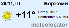 Представляем прогноз погоды в Боржоми на 3 дня (сегодня, завтра и послезавтра). Подробнее...Щелкните на соответствующем дне, чтобы получить подробный прогноз по нему. Для просмотра расширенных данных щелкните по заголовку соответствующего блока из группы блоков, расплолженных ниже основного прогноза. Для получения данных на другие дни используйте стрелки слева и справа от таблицы или навигационное меню в левой колонке страницы. Свернуть