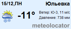 Представляем прогноз погоды в Юльевке на 3 дня (сегодня, завтра и послезавтра). Подробнее...Щелкните на соответствующем дне, чтобы получить подробный прогноз по нему. Для просмотра расширенных данных щелкните по заголовку соответствующего блока из группы блоков, расплолженных ниже основного прогноза. Для получения данных на другие дни используйте стрелки слева и справа от таблицы или навигационное меню в левой колонке страницы. Свернуть
