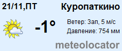 Представляем прогноз погоды в Куропаткино на 3 дня (сегодня, завтра и послезавтра). Подробнее...Щелкните на соответствующем дне, чтобы получить подробный прогноз по нему. Для просмотра расширенных данных щелкните по заголовку соответствующего блока из группы блоков, расплолженных ниже основного прогноза. Для получения данных на другие дни используйте стрелки слева и справа от таблицы или навигационное меню в левой колонке страницы. Свернуть