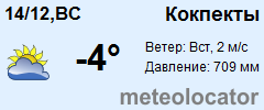 Представляем прогноз погоды в Кокпекты на 3 дня (сегодня, завтра и послезавтра). Подробнее...Щелкните на соответствующем дне, чтобы получить подробный прогноз по нему. Для просмотра расширенных данных щелкните по заголовку соответствующего блока из группы блоков, расплолженных ниже основного прогноза. Для получения данных на другие дни используйте стрелки слева и справа от таблицы или навигационное меню в левой колонке страницы. Свернуть