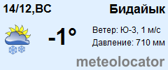 Представляем прогноз погоды в Бидайыке на 3 дня (сегодня, завтра и послезавтра). Подробнее...Щелкните на соответствующем дне, чтобы получить подробный прогноз по нему. Для просмотра расширенных данных щелкните по заголовку соответствующего блока из группы блоков, расплолженных ниже основного прогноза. Для получения данных на другие дни используйте стрелки слева и справа от таблицы или навигационное меню в левой колонке страницы. Свернуть