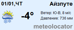 Представляем прогноз погоды в Айзпуте на 3 дня (сегодня, завтра и послезавтра). Подробнее...Щелкните на соответствующем дне, чтобы получить подробный прогноз по нему. Для просмотра расширенных данных щелкните по заголовку соответствующего блока из группы блоков, расплолженных ниже основного прогноза. Для получения данных на другие дни используйте стрелки слева и справа от таблицы или навигационное меню в левой колонке страницы. Свернуть