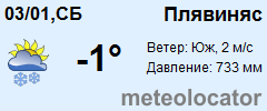 Представляем прогноз погоды в Плявинясе на 3 дня (сегодня, завтра и послезавтра). Подробнее...Щелкните на соответствующем дне, чтобы получить подробный прогноз по нему. Для просмотра расширенных данных щелкните по заголовку соответствующего блока из группы блоков, расплолженных ниже основного прогноза. Для получения данных на другие дни используйте стрелки слева и справа от таблицы или навигационное меню в левой колонке страницы. Свернуть