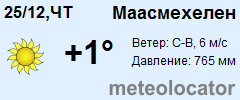 Представляем прогноз погоды в Маасмехелене на 3 дня (сегодня, завтра и послезавтра). Подробнее...Щелкните на соответствующем дне, чтобы получить подробный прогноз по нему. Для просмотра расширенных данных щелкните по заголовку соответствующего блока из группы блоков, расплолженных ниже основного прогноза. Для получения данных на другие дни используйте стрелки слева и справа от таблицы или навигационное меню в левой колонке страницы. Свернуть