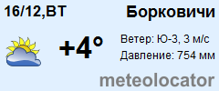 Прогноз погоды в Борковичах представляет собой результат всестороннего анализа прогностических данных. Кроме того, для учета микроклиматических особенностей погоды и климата города Борковичи в алгоритме используются данные, поступающие с наземных станций. Все это делает возможным обновление и уточнение информации о погоде каждые 3 часа, так что Вы получаете самый свежий и достоверный прогноз погоды среди всех погодных сайтов.