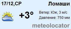 Представляем прогноз погоды в Ломашах на 3 дня (сегодня, завтра и послезавтра). Подробнее...Щелкните на соответствующем дне, чтобы получить подробный прогноз по нему. Для просмотра расширенных данных щелкните по заголовку соответствующего блока из группы блоков, расплолженных ниже основного прогноза. Для получения данных на другие дни используйте стрелки слева и справа от таблицы или навигационное меню в левой колонке страницы. Свернуть