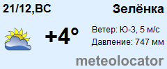 Представляем прогноз погоды в Зелёнке на 3 дня (сегодня, завтра и послезавтра). Подробнее...Щелкните на соответствующем дне, чтобы получить подробный прогноз по нему. Для просмотра расширенных данных щелкните по заголовку соответствующего блока из группы блоков, расплолженных ниже основного прогноза. Для получения данных на другие дни используйте стрелки слева и справа от таблицы или навигационное меню в левой колонке страницы. Свернуть