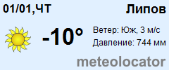 Представляем прогноз погоды в Липове на 3 дня (сегодня, завтра и послезавтра). Подробнее...Щелкните на соответствующем дне, чтобы получить подробный прогноз по нему. Для просмотра расширенных данных щелкните по заголовку соответствующего блока из группы блоков, расплолженных ниже основного прогноза. Для получения данных на другие дни используйте стрелки слева и справа от таблицы или навигационное меню в левой колонке страницы. Свернуть