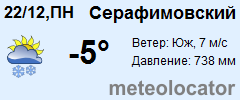 Представляем прогноз погоды в Серафимовском на 3 дня (сегодня, завтра и послезавтра). Подробнее...Щелкните на соответствующем дне, чтобы получить подробный прогноз по нему. Для просмотра расширенных данных щелкните по заголовку соответствующего блока из группы блоков, расплолженных ниже основного прогноза. Для получения данных на другие дни используйте стрелки слева и справа от таблицы или навигационное меню в левой колонке страницы. Свернуть