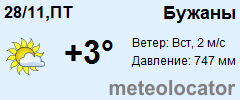 Представляем прогноз погоды в Бужанах на 3 дня (сегодня, завтра и послезавтра). Подробнее...Щелкните на соответствующем дне, чтобы получить подробный прогноз по нему. Для просмотра расширенных данных щелкните по заголовку соответствующего блока из группы блоков, расплолженных ниже основного прогноза. Для получения данных на другие дни используйте стрелки слева и справа от таблицы или навигационное меню в левой колонке страницы. Свернуть