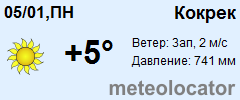 Представляем прогноз погоды в Кокреке на 3 дня (сегодня, завтра и послезавтра). Подробнее...Щелкните на соответствующем дне, чтобы получить подробный прогноз по нему. Для просмотра расширенных данных щелкните по заголовку соответствующего блока из группы блоков, расплолженных ниже основного прогноза. Для получения данных на другие дни используйте стрелки слева и справа от таблицы или навигационное меню в левой колонке страницы. Свернуть