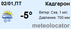 Представляем прогноз погоды в Кадгароне на 3 дня (сегодня, завтра и послезавтра). Подробнее...Щелкните на соответствующем дне, чтобы получить подробный прогноз по нему. Для просмотра расширенных данных щелкните по заголовку соответствующего блока из группы блоков, расплолженных ниже основного прогноза. Для получения данных на другие дни используйте стрелки слева и справа от таблицы или навигационное меню в левой колонке страницы. Свернуть