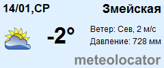 Представляем прогноз погоды в Змейской на 3 дня (сегодня, завтра и послезавтра). Подробнее...Щелкните на соответствующем дне, чтобы получить подробный прогноз по нему. Для просмотра расширенных данных щелкните по заголовку соответствующего блока из группы блоков, расплолженных ниже основного прогноза. Для получения данных на другие дни используйте стрелки слева и справа от таблицы или навигационное меню в левой колонке страницы. Свернуть