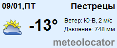 Представляем прогноз погоды в Пестрецах на 3 дня (сегодня, завтра и послезавтра). Подробнее...Щелкните на соответствующем дне, чтобы получить подробный прогноз по нему. Для просмотра расширенных данных щелкните по заголовку соответствующего блока из группы блоков, расплолженных ниже основного прогноза. Для получения данных на другие дни используйте стрелки слева и справа от таблицы или навигационное меню в левой колонке страницы. Свернуть