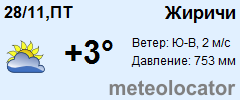 Представляем прогноз погоды в Жиричах на 3 дня (сегодня, завтра и послезавтра). Подробнее...Щелкните на соответствующем дне, чтобы получить подробный прогноз по нему. Для просмотра расширенных данных щелкните по заголовку соответствующего блока из группы блоков, расплолженных ниже основного прогноза. Для получения данных на другие дни используйте стрелки слева и справа от таблицы или навигационное меню в левой колонке страницы. Свернуть