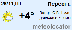 Представляем прогноз погоды в Переспе на 3 дня (сегодня, завтра и послезавтра). Подробнее...Щелкните на соответствующем дне, чтобы получить подробный прогноз по нему. Для просмотра расширенных данных щелкните по заголовку соответствующего блока из группы блоков, расплолженных ниже основного прогноза. Для получения данных на другие дни используйте стрелки слева и справа от таблицы или навигационное меню в левой колонке страницы. Свернуть