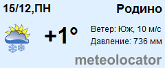 Представляем прогноз погоды в Родино на 3 дня (сегодня, завтра и послезавтра). Подробнее...Щелкните на соответствующем дне, чтобы получить подробный прогноз по нему. Для просмотра расширенных данных щелкните по заголовку соответствующего блока из группы блоков, расплолженных ниже основного прогноза. Для получения данных на другие дни используйте стрелки слева и справа от таблицы или навигационное меню в левой колонке страницы. Свернуть