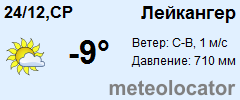 Представляем прогноз погоды в Лейкангере на 3 дня (сегодня, завтра и послезавтра). Подробнее...Щелкните на соответствующем дне, чтобы получить подробный прогноз по нему. Для просмотра расширенных данных щелкните по заголовку соответствующего блока из группы блоков, расплолженных ниже основного прогноза. Для получения данных на другие дни используйте стрелки слева и справа от таблицы или навигационное меню в левой колонке страницы. Свернуть