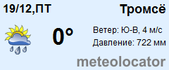 Представляем прогноз погоды в Тромсё на 3 дня (сегодня, завтра и послезавтра). Подробнее...Щелкните на соответствующем дне, чтобы получить подробный прогноз по нему. Для просмотра расширенных данных щелкните по заголовку соответствующего блока из группы блоков, расплолженных ниже основного прогноза. Для получения данных на другие дни используйте стрелки слева и справа от таблицы или навигационное меню в левой колонке страницы. Свернуть