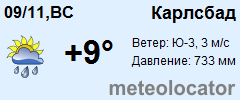 Представляем прогноз погоды в Карлсбаде на 3 дня (сегодня, завтра и послезавтра). Подробнее...Щелкните на соответствующем дне, чтобы получить подробный прогноз по нему. Для просмотра расширенных данных щелкните по заголовку соответствующего блока из группы блоков, расплолженных ниже основного прогноза. Для получения данных на другие дни используйте стрелки слева и справа от таблицы или навигационное меню в левой колонке страницы. Свернуть