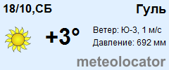 Представляем прогноз погоды в Гуле на 3 дня (сегодня, завтра и послезавтра). Подробнее...Щелкните на соответствующем дне, чтобы получить подробный прогноз по нему. Для просмотра расширенных данных щелкните по заголовку соответствующего блока из группы блоков, расплолженных ниже основного прогноза. Для получения данных на другие дни используйте стрелки слева и справа от таблицы или навигационное меню в левой колонке страницы. Свернуть