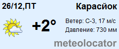 Представляем прогноз погоды в Карасйоке на 3 дня (сегодня, завтра и послезавтра). Подробнее...Щелкните на соответствующем дне, чтобы получить подробный прогноз по нему. Для просмотра расширенных данных щелкните по заголовку соответствующего блока из группы блоков, расплолженных ниже основного прогноза. Для получения данных на другие дни используйте стрелки слева и справа от таблицы или навигационное меню в левой колонке страницы. Свернуть