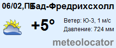 Представляем прогноз погоды в Бад-Фредрихсхолле на 3 дня (сегодня, завтра и послезавтра). Подробнее...Щелкните на соответствующем дне, чтобы получить подробный прогноз по нему. Для просмотра расширенных данных щелкните по заголовку соответствующего блока из группы блоков, расплолженных ниже основного прогноза. Для получения данных на другие дни используйте стрелки слева и справа от таблицы или навигационное меню в левой колонке страницы. Свернуть