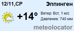 Представляем прогноз погоды в Эппингене на 3 дня (сегодня, завтра и послезавтра). Подробнее...Щелкните на соответствующем дне, чтобы получить подробный прогноз по нему. Для просмотра расширенных данных щелкните по заголовку соответствующего блока из группы блоков, расплолженных ниже основного прогноза. Для получения данных на другие дни используйте стрелки слева и справа от таблицы или навигационное меню в левой колонке страницы. Свернуть