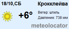 Представляем прогноз погоды в Крокклейве на 3 дня (сегодня, завтра и послезавтра). Подробнее...Щелкните на соответствующем дне, чтобы получить подробный прогноз по нему. Для просмотра расширенных данных щелкните по заголовку соответствующего блока из группы блоков, расплолженных ниже основного прогноза. Для получения данных на другие дни используйте стрелки слева и справа от таблицы или навигационное меню в левой колонке страницы. Свернуть
