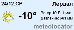 Представляем прогноз погоды в Лердале на 3 дня (сегодня, завтра и послезавтра). Подробнее...Щелкните на соответствующем дне, чтобы получить подробный прогноз по нему. Для просмотра расширенных данных щелкните по заголовку соответствующего блока из группы блоков, расплолженных ниже основного прогноза. Для получения данных на другие дни используйте стрелки слева и справа от таблицы или навигационное меню в левой колонке страницы. Свернуть