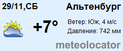 Представляем прогноз погоды в Альтенбурге на 3 дня (сегодня, завтра и послезавтра). Подробнее...Щелкните на соответствующем дне, чтобы получить подробный прогноз по нему. Для просмотра расширенных данных щелкните по заголовку соответствующего блока из группы блоков, расплолженных ниже основного прогноза. Для получения данных на другие дни используйте стрелки слева и справа от таблицы или навигационное меню в левой колонке страницы. Свернуть