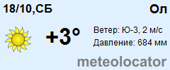 Представляем прогноз погоды в Оле на 3 дня (сегодня, завтра и послезавтра). Подробнее...Щелкните на соответствующем дне, чтобы получить подробный прогноз по нему. Для просмотра расширенных данных щелкните по заголовку соответствующего блока из группы блоков, расплолженных ниже основного прогноза. Для получения данных на другие дни используйте стрелки слева и справа от таблицы или навигационное меню в левой колонке страницы. Свернуть