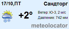 Представляем прогноз погоды в Сандторге на 3 дня (сегодня, завтра и послезавтра). Подробнее...Щелкните на соответствующем дне, чтобы получить подробный прогноз по нему. Для просмотра расширенных данных щелкните по заголовку соответствующего блока из группы блоков, расплолженных ниже основного прогноза. Для получения данных на другие дни используйте стрелки слева и справа от таблицы или навигационное меню в левой колонке страницы. Свернуть