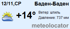 Представляем прогноз погоды в Баден-Бадене на 3 дня (сегодня, завтра и послезавтра). Подробнее...Щелкните на соответствующем дне, чтобы получить подробный прогноз по нему. Для просмотра расширенных данных щелкните по заголовку соответствующего блока из группы блоков, расплолженных ниже основного прогноза. Для получения данных на другие дни используйте стрелки слева и справа от таблицы или навигационное меню в левой колонке страницы. Свернуть
