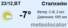 Представляем прогноз погоды в Сталхейме на 3 дня (сегодня, завтра и послезавтра). Подробнее...Щелкните на соответствующем дне, чтобы получить подробный прогноз по нему. Для просмотра расширенных данных щелкните по заголовку соответствующего блока из группы блоков, расплолженных ниже основного прогноза. Для получения данных на другие дни используйте стрелки слева и справа от таблицы или навигационное меню в левой колонке страницы. Свернуть