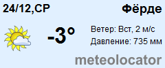 Представляем прогноз погоды в Фёрде на 3 дня (сегодня, завтра и послезавтра). Подробнее...Щелкните на соответствующем дне, чтобы получить подробный прогноз по нему. Для просмотра расширенных данных щелкните по заголовку соответствующего блока из группы блоков, расплолженных ниже основного прогноза. Для получения данных на другие дни используйте стрелки слева и справа от таблицы или навигационное меню в левой колонке страницы. Свернуть