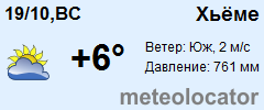 Представляем прогноз погоды в Хьёме на 3 дня (сегодня, завтра и послезавтра). Подробнее...Щелкните на соответствующем дне, чтобы получить подробный прогноз по нему. Для просмотра расширенных данных щелкните по заголовку соответствующего блока из группы блоков, расплолженных ниже основного прогноза. Для получения данных на другие дни используйте стрелки слева и справа от таблицы или навигационное меню в левой колонке страницы. Свернуть