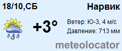 Представляем прогноз погоды в Нарвике на 3 дня (сегодня, завтра и послезавтра). Подробнее...Щелкните на соответствующем дне, чтобы получить подробный прогноз по нему. Для просмотра расширенных данных щелкните по заголовку соответствующего блока из группы блоков, расплолженных ниже основного прогноза. Для получения данных на другие дни используйте стрелки слева и справа от таблицы или навигационное меню в левой колонке страницы. Свернуть