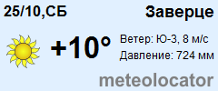 Представляем прогноз погоды в Заверце на 3 дня (сегодня, завтра и послезавтра). Подробнее...Щелкните на соответствующем дне, чтобы получить подробный прогноз по нему. Для просмотра расширенных данных щелкните по заголовку соответствующего блока из группы блоков, расплолженных ниже основного прогноза. Для получения данных на другие дни используйте стрелки слева и справа от таблицы или навигационное меню в левой колонке страницы. Свернуть