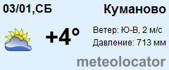 Представляем прогноз погоды в Куманово на 3 дня (сегодня, завтра и послезавтра). Подробнее...Щелкните на соответствующем дне, чтобы получить подробный прогноз по нему. Для просмотра расширенных данных щелкните по заголовку соответствующего блока из группы блоков, расплолженных ниже основного прогноза. Для получения данных на другие дни используйте стрелки слева и справа от таблицы или навигационное меню в левой колонке страницы. Свернуть