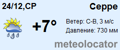 Представляем прогноз погоды в Серре на 3 дня (сегодня, завтра и послезавтра). Подробнее...Щелкните на соответствующем дне, чтобы получить подробный прогноз по нему. Для просмотра расширенных данных щелкните по заголовку соответствующего блока из группы блоков, расплолженных ниже основного прогноза. Для получения данных на другие дни используйте стрелки слева и справа от таблицы или навигационное меню в левой колонке страницы. Свернуть