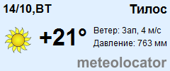 Представляем прогноз погоды на Острове Тилос на 3 дня (сегодня, завтра и послезавтра). Подробнее...Щелкните на соответствующем дне, чтобы получить подробный прогноз по нему. Для просмотра расширенных данных щелкните по заголовку соответствующего блока из группы блоков, расплолженных ниже основного прогноза. Для получения данных на другие дни используйте стрелки слева и справа от таблицы или навигационное меню в левой колонке страницы. Свернуть