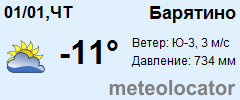 Представляем прогноз погоды в Барятино на 3 дня (сегодня, завтра и послезавтра). Подробнее...Щелкните на соответствующем дне, чтобы получить подробный прогноз по нему. Для просмотра расширенных данных щелкните по заголовку соответствующего блока из группы блоков, расплолженных ниже основного прогноза. Для получения данных на другие дни используйте стрелки слева и справа от таблицы или навигационное меню в левой колонке страницы. Свернуть