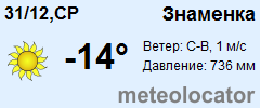 Представляем прогноз погоды в Знаменке на 3 дня (сегодня, завтра и послезавтра). Подробнее...Щелкните на соответствующем дне, чтобы получить подробный прогноз по нему. Для просмотра расширенных данных щелкните по заголовку соответствующего блока из группы блоков, расплолженных ниже основного прогноза. Для получения данных на другие дни используйте стрелки слева и справа от таблицы или навигационное меню в левой колонке страницы. Свернуть