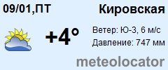 Представляем прогноз погоды в Кировской на 3 дня (сегодня, завтра и послезавтра). Подробнее...Щелкните на соответствующем дне, чтобы получить подробный прогноз по нему. Для просмотра расширенных данных щелкните по заголовку соответствующего блока из группы блоков, расплолженных ниже основного прогноза. Для получения данных на другие дни используйте стрелки слева и справа от таблицы или навигационное меню в левой колонке страницы. Свернуть