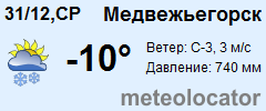 Представляем прогноз погоды в Медвежьегорске на 3 дня (сегодня, завтра и послезавтра). Подробнее...Щелкните на соответствующем дне, чтобы получить подробный прогноз по нему. Для просмотра расширенных данных щелкните по заголовку соответствующего блока из группы блоков, расплолженных ниже основного прогноза. Для получения данных на другие дни используйте стрелки слева и справа от таблицы или навигационное меню в левой колонке страницы. Свернуть
