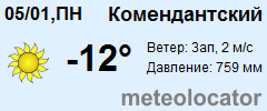 Представляем прогноз погоды в Комендантском аэродроме на 3 дня (сегодня, завтра и послезавтра). Подробнее...Щелкните на соответствующем дне, чтобы получить подробный прогноз по нему. Для просмотра расширенных данных щелкните по заголовку соответствующего блока из группы блоков, расплолженных ниже основного прогноза. Для получения данных на другие дни используйте стрелки слева и справа от таблицы или навигационное меню в левой колонке страницы. Свернуть