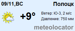 Представляем прогноз погоды в Полоцке на 3 дня (сегодня, завтра и послезавтра). Подробнее...Щелкните на соответствующем дне, чтобы получить подробный прогноз по нему. Для просмотра расширенных данных щелкните по заголовку соответствующего блока из группы блоков, расплолженных ниже основного прогноза. Для получения данных на другие дни используйте стрелки слева и справа от таблицы или навигационное меню в левой колонке страницы. Свернуть
