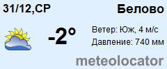 Представляем прогноз погоды в Белово на 3 дня (сегодня, завтра и послезавтра). Подробнее...Щелкните на соответствующем дне, чтобы получить подробный прогноз по нему. Для просмотра расширенных данных щелкните по заголовку соответствующего блока из группы блоков, расплолженных ниже основного прогноза. Для получения данных на другие дни используйте стрелки слева и справа от таблицы или навигационное меню в левой колонке страницы. Свернуть