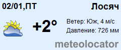 Представляем прогноз погоды в Лосяче на 3 дня (сегодня, завтра и послезавтра). Подробнее...Щелкните на соответствующем дне, чтобы получить подробный прогноз по нему. Для просмотра расширенных данных щелкните по заголовку соответствующего блока из группы блоков, расплолженных ниже основного прогноза. Для получения данных на другие дни используйте стрелки слева и справа от таблицы или навигационное меню в левой колонке страницы. Свернуть